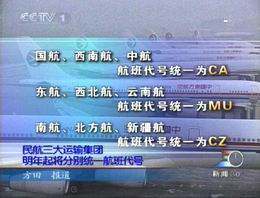 據(jù)中央電視臺報道,2003年1月1日起,重組后的國航、東航、南航三大民航運輸集團的航班代號將分別統(tǒng)一為CA、MU和CZ,同時西南航、中航、西北航、云南航、北方航、新疆航原有代號將不再使用。統(tǒng)一航班代號后,三大航空集團的飛機也將分別統(tǒng)一標(biāo)志和名稱,常旅客計劃也將實現(xiàn)內(nèi)部統(tǒng)一,擴展了常旅客會員累積里程和兌換獎勵的航班范圍。同時三大運輸集團還將分別統(tǒng)一航空餐食標(biāo)準(zhǔn)。為了保證航班運行正常和平穩(wěn)過渡,三大集團近期不會對航班計劃和航線布局做大的調(diào)整。