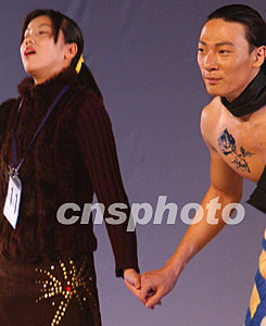 一名時裝設(shè)計的女大學(xué)生和她的男模特年終在北京展示會亮相,一身黑裝的她為男模特胸前設(shè)計了一朵藍玫瑰,剛?cè)嵯酀。作?賈國榮