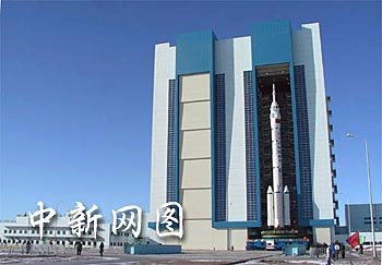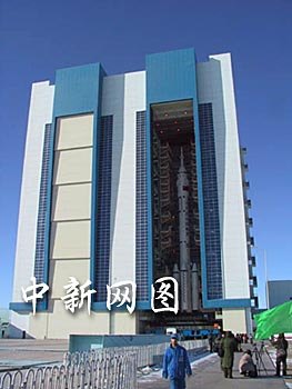 中國酒泉衛(wèi)星發(fā)射中心總裝測試廠房中巍然聳立的“神舟”“神箭”組合體:“神舟”為中國載人航天工程進(jìn)行第四次飛行試驗(yàn)的飛船;“神箭”即中國運(yùn)載火箭技術(shù)研究院研制的“長征二號F”運(yùn)載火箭。中新社記者 孫自法 攝
