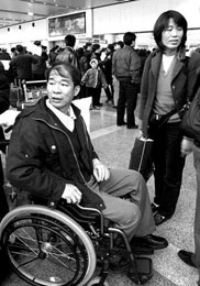 昨天下午5點(diǎn)40分。首都國(guó)際機(jī)場(chǎng)國(guó)際到港出口處。在推著大包小包行李的人流中,一個(gè)頭發(fā)稀疏的中年男子坐在輪椅上被緩緩?fù)瞥。他就是?002年4月12日以色列耶路撒冷爆炸案中受傷的中國(guó)勞工林金謀。