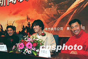 總投資七百萬美元、有韓國(guó)版《英雄》之稱的《武士》四日在北京舉行中國(guó)首映禮,欲與熱播中的《英雄》一爭(zhēng)高下。圖為片中主角韓國(guó)當(dāng)紅影星朱鎮(zhèn)模、鄭宇盛、與中國(guó)影星于榮光(從左至右)與北京媒體見面。作者:武仲林