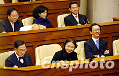 香港政務(wù)司長曾蔭權(quán)、財政司長梁錦松、律政司長梁愛詩等政府高官及立法會議員,1月8日出席立法會,聽取行政長官董建華發(fā)表施政報告。洪少葵 攝