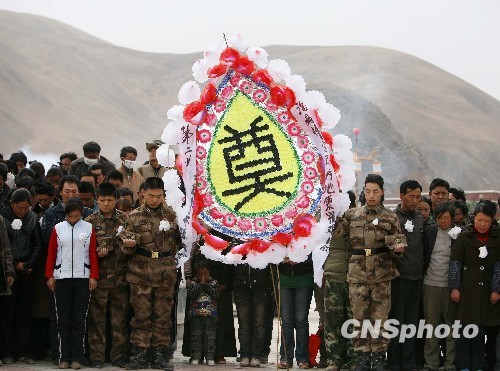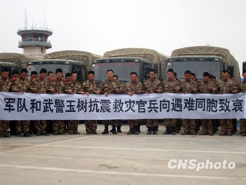圖:玉樹(shù)機(jī)場(chǎng)抗震救災(zāi)官兵向遇難同胞致哀