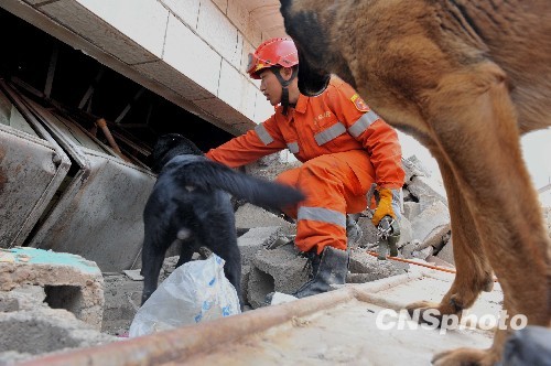 圖:搜救犬黑貝玉樹(shù)地震廢墟上的一個(gè)清晨