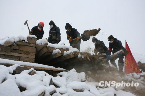 圖:救援大隊(duì)冒雪在玉樹(shù)實(shí)施救援