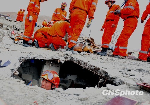 地震救援隊(duì)在玉樹(shù)地震災(zāi)區(qū)廢墟上默哀