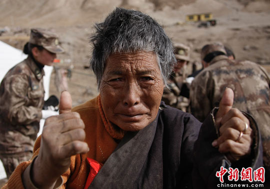 藏族老阿媽向抗震醫(yī)療隊員豎大拇指