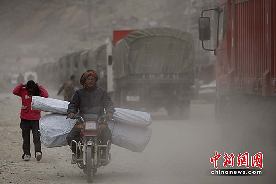 青海玉樹地震:領(lǐng)取救災(zāi)物品的受災(zāi)民眾行走在塵土中