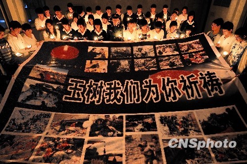 圖:首都大學(xué)生為地震災(zāi)區(qū)燭光祈福