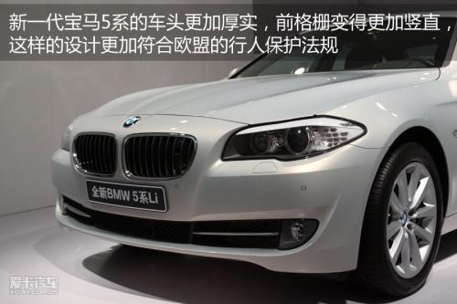 從前臉看,新一代寶馬5系的車頭更加厚實(shí),前格柵變得更加豎直,這樣的設(shè)計(jì)更加符合歐盟的行人保護(hù)法規(guī),前格柵的設(shè)計(jì)更加接近7系,但與7系相比,格柵的變得更加修長(zhǎng)。另外新5系發(fā)動(dòng)機(jī)蓋上有兩條隆起的折線一直向?qū)汃R的車標(biāo)收縮,更加動(dòng)感。