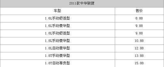 2010年7月8日,華晨中華正式推出了2011款駿捷車型,此次推出的新車共有7款不同配置的車型,分為1.6L、1.8L、1.8T三種動(dòng)力調(diào)教。據(jù)悉,新車整體的售價(jià)區(qū)間為8.88-15.88萬元。