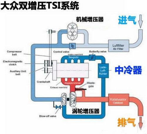 大眾TSI的含義:即Turbo-charging(渦輪增壓)、Super-charging(機(jī)械增壓)和Injection(燃油直噴)三個關(guān)鍵特色的首字母縮寫。也就是說,原汁原味的TSI,應(yīng)當(dāng)是具備三大技術(shù)的——渦輪與機(jī)械的復(fù)合增壓,加上缸內(nèi)直噴技術(shù)。