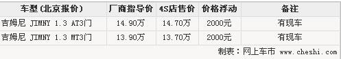 吉姆尼是鈴木引進(jìn)中國(guó)的一款微型SUV,出色的越野能力和時(shí)尚可愛的外觀,讓吉姆尼在國(guó)內(nèi)風(fēng)靡一時(shí)。不過由于價(jià)格和實(shí)際使用價(jià)值方面的問題,吉姆尼的銷量很一般。近期,網(wǎng)上車市走訪了北京地區(qū)長(zhǎng)安鈴木4S店,了解到吉姆尼目前有2000元的現(xiàn)金優(yōu)惠,具體信息請(qǐng)參考下表: