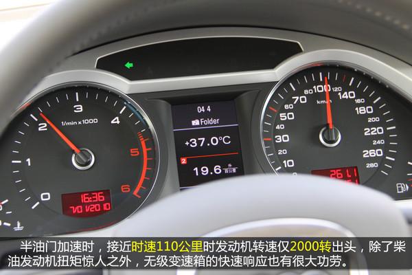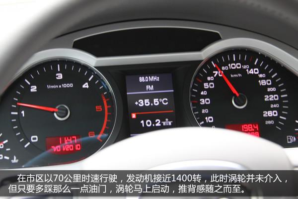 人多車多,廣州特色,都城已經(jīng)成為廣州人生活的一部分。面的蠕動似的前進,發(fā)動機轉(zhuǎn)速僅比怠速高一點點即可驅(qū)動車輛前進(約1200轉(zhuǎn)/分鐘),能把轉(zhuǎn)速控制在如此低的水平,正是柴油發(fā)動機低速大扭矩的體現(xiàn)。但在這樣的環(huán)境中,并沒多少機會能給渦輪增壓系統(tǒng)發(fā)揮,渦輪打開的轉(zhuǎn)速為1400轉(zhuǎn)/分鐘,憋屈著。由于轉(zhuǎn)速較低,加上奧迪出色的隔音做工,車內(nèi)非常安靜,聽著BOSE音響美妙的樂章,就算路上再堵也能保持心情舒暢。