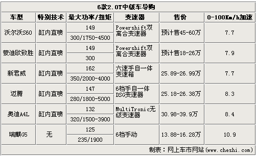 我們看到上述6款車中,有5款發(fā)動(dòng)機(jī)是采用缸內(nèi)直噴技術(shù),三款采用了雙離合變速器,只有來(lái)自自主的瑞麒G5要遜色很多,不過(guò)價(jià)格方面的優(yōu)勢(shì)是明顯的。在功率、扭矩方面,新君威優(yōu)勢(shì)明顯,體現(xiàn)在0-100Km/h加速上也是僅7.7秒,與年底上市的沃爾沃S60相當(dāng)。而蒙迪歐致勝考慮到沃爾沃與福特的關(guān)系,至少?gòu)膮?shù)上看與S60的2.0T發(fā)動(dòng)機(jī)很可能是同一款。