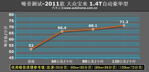 相信1.4T發(fā)動(dòng)機(jī)配合7速DSG的行駛特性大家都比較了解,車(chē)動(dòng)起來(lái)不過(guò)1200轉(zhuǎn)便從一擋切換至二擋,而之后的換擋動(dòng)作也都在2000轉(zhuǎn)之內(nèi)(日常駕駛)完成,因此發(fā)動(dòng)機(jī)噪音值會(huì)控制的很好,圖表中特意添加了之前測(cè)試的1.6L寶來(lái)的實(shí)測(cè)噪音值,可以看到除怠速之外都要比1.4T版本高出不少。美中不足的是與一些2.0L及更大排量的自然吸氣發(fā)動(dòng)機(jī)相比,在高速行駛時(shí)這臺(tái)1.4T發(fā)動(dòng)機(jī)傳到駕駛艙的某種震動(dòng)的響聲還是能察覺(jué)到的。