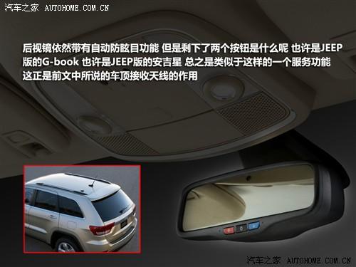 車內(nèi)反光鏡上有三個按鈕,中間的為自動防眩目的開關(guān),那另外兩個是什么呢,或許是JEEP的“G-book”,或許是JEEP的“安吉星”,總之我們猜測就是類似于這兩個系統(tǒng)的一種服務(wù)功能,而上文提到的車頂天線應(yīng)該就是該系統(tǒng)的接收模塊吧。