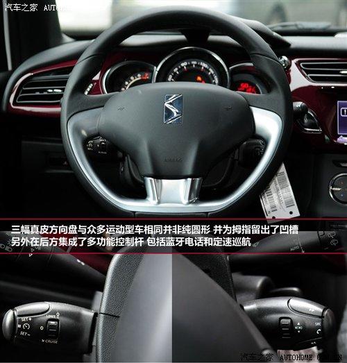 真皮三輻方向盤(pán)與眾多運(yùn)動(dòng)型車相同,并非純圓形,拇指處的凹槽方便握緊;多功能方向盤(pán)后面的控制桿集成了多功能按鍵,包含了藍(lán)牙電話和定速巡航。
