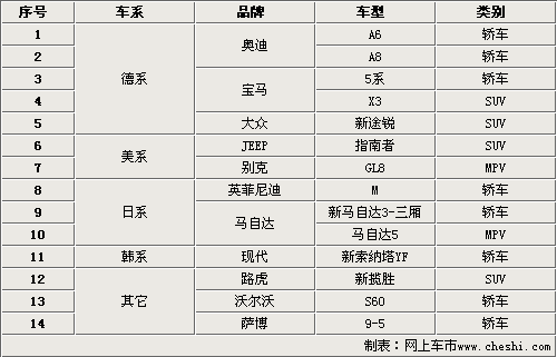 隨著中國汽車市場的逐漸成熟,越來越多的汽車廠商將重點(diǎn)放在了中國汽車市場。目前在中國汽車市場上熱銷的部分車型經(jīng)過幾年的洗禮,即將迎來它們的全新?lián)Q代產(chǎn)品,這些車型無疑將會(huì)使原本競爭激烈市場變得更加厲害,同時(shí)也豐富了消費(fèi)者對(duì)車型的選擇。我們細(xì)數(shù)了一下下半年上市的新車,從中發(fā)現(xiàn)了14款即將全新?lián)Q代的車型,其中不乏一些重量級(jí)產(chǎn)品,它們無論是從動(dòng)力系統(tǒng)、舒適配置還是車身尺寸都得到了提升。譬如:奧迪的A8、A6;寶馬的全新5系和X3;路虎的全新攬勝;沃爾沃S60等等。具體車型見下表: