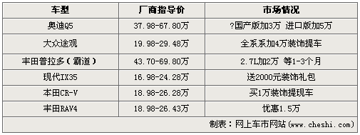 在文中提到的6款熱銷SUV車型中,加價賣車的情況似乎有所并沒有太多弱化的趨勢。加價幅度最大的是奧迪新晉高級SUV車型Q5,國產(chǎn)版車型全系加價3萬,進口版車型全系加價5萬。豐田召回風(fēng)波的影響尚未煙消云散,旗下熱銷的SUV車型RAV4做出了1.5萬的讓利,與之前的加價形成了非常鮮明的對比。