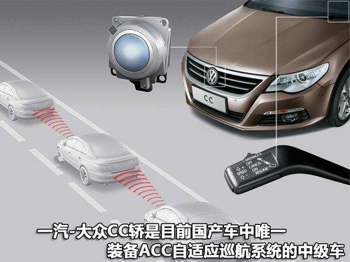 一汽-大眾CC轎跑車是目前唯一裝備ACC自適應巡航的國產車型,提升了舒適性和安全性。除此之外,F(xiàn)ront Assist預碰撞安全系統(tǒng)、Lane Assist車道保持系統(tǒng)、Park Assist智能泊車輔助系統(tǒng)以及Rear Assist后視影像系統(tǒng)也均出現(xiàn)在一汽-大眾CC的高配車型上。