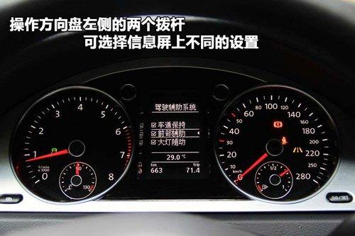 一汽-大眾CC轎跑車儀表盤雖然造型設(shè)計(jì)與邁騰略有差異,但同樣采用白色冷光背景,清晰易讀。而在轉(zhuǎn)速表和時(shí)速表中間集成了信息顯示屏,通過(guò)操作方向盤左側(cè)的兩個(gè)撥桿,可以調(diào)節(jié)和選擇不同的設(shè)置。