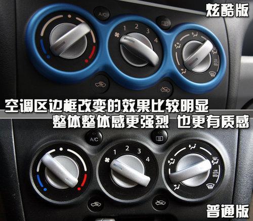 接著是中控臺(tái)主操作區(qū),有些朋友可能在中控臺(tái)整體圖上看到了音頻區(qū)似乎發(fā)生了一些變化,不要急,我們最后再說(shuō)這一項(xiàng)驚天的改變。首先我們先來(lái)看空調(diào)區(qū)的三個(gè)圓形旋鈕,看過(guò)老款設(shè)計(jì)之后,我們可以看出三個(gè)旋鈕的整體感并不強(qiáng),雖然做了凹凸的設(shè)計(jì),但是質(zhì)感還是不夠。炫酷版就不一樣了,雖然也只是加了藍(lán)色邊框,但是完全將三個(gè)旋鈕串聯(lián)起來(lái),并且十分清晰。