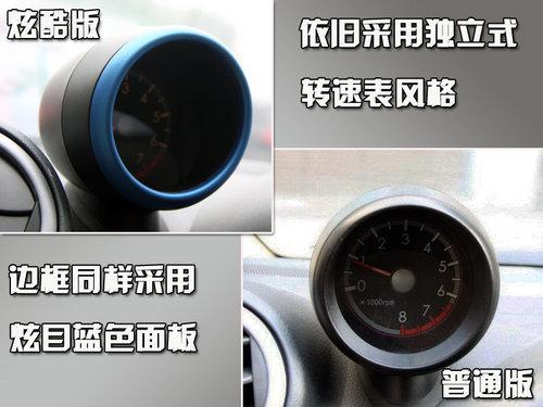 接著是大家普遍都十分欣賞的轉(zhuǎn)速表,了解新奧拓的朋友都知道,新奧拓沒(méi)有墨守陳規(guī)的將轉(zhuǎn)速表和車(chē)速表放在一起,也沒(méi)有使用電子式顯示。獨(dú)立的轉(zhuǎn)速表恐怕我們也就只有在一些性能車(chē)或改裝車(chē)上才能看到。這個(gè)設(shè)計(jì)本就已經(jīng)為新奧拓加分不少,炫酷版將外緣邊框部位也做了處理,藍(lán)色的邊框看起來(lái)比之前更加律動(dòng)。