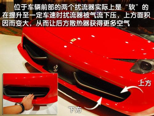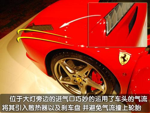 轉(zhuǎn)到車(chē)頭的上方您會(huì)發(fā)現(xiàn)在458Italia的大燈一側(cè)會(huì)有一個(gè)隱藏的通風(fēng)口,這里的設(shè)計(jì)能夠讓從車(chē)頭過(guò)來(lái)的氣流在經(jīng)過(guò)這里的時(shí)候進(jìn)入通風(fēng)口,使其變?yōu)橐嫔崞饕约扒拜唲x車(chē)系統(tǒng)的冷卻氣流,類(lèi)似這樣的巧妙設(shè)計(jì)還有很多。