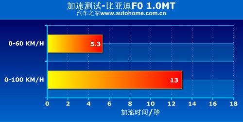 比亞迪F0搭載的是排量為1.0L的3缸全鋁發(fā)動機,最大功率為68馬力,最大扭矩90牛米,在國內同級別的車型中,它的動力性是比較出色的,0-100Km/h加速只用了13秒,在微型車中算是比較不錯的成績了,但表現(xiàn)不佳的剎車成績讓人缺乏安全感。關于它詳細的測試,可以參考下面的文章: