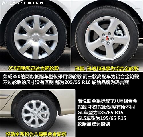 榮威350在高低配車型上有兩種不同的輪轂,但輪胎的尺寸都是205/55 R16。而悅動則是全系標(biāo)配8幅鋁合金輪轂,但在低配車型上僅使用了185/65 R15輪胎,而高配車型上將輪胎的寬度升級到195。從效果上看,榮威350更寬更大的輪胎顯然更漂亮,但悅動標(biāo)配鋁合金輪轂更厚道一些。
