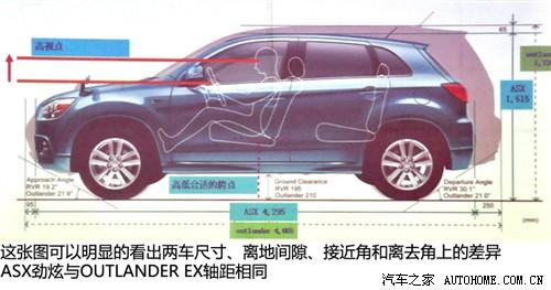 ASX勁炫和OUTLANDER EX同平臺(tái)且軸距相同,但在車身尺寸、離地間隙、以及接近角和離去角上都有差異,從下圖中可看出數(shù)據(jù)上的差別。