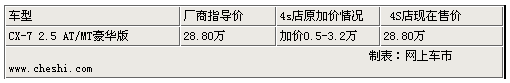 作為一款具有跑車化外觀和馬自達(dá)操控DNA的中型SUV,馬自達(dá)CX-7自去年11月上市以來一直備受關(guān)注。根據(jù)網(wǎng)上車市價格監(jiān)測系統(tǒng)顯示,自CX-7上市以來,各4S店一直持續(xù)提現(xiàn)車加價0.5萬-3.2萬元,而近期北京馬自達(dá)4S店出現(xiàn)了平價銷售現(xiàn)象,售價為廠商指導(dǎo)價28.8萬,少量現(xiàn)車供應(yīng)。具體車型價格如下: