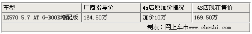 如果提到豪華SUV,大家一定首先想到寶馬X6、奔馳GL、保時(shí)捷卡宴以及路虎攬勝等豪華SUV中的“大佬”們,作為國際知名越野極強(qiáng)悍的汽車品牌,雷克薩斯的每一款車型都可謂經(jīng)典,而雷克薩斯LX570又重新詮釋了豪華SUV的新尺度,與上一代的LX470相比,你卻不得不承認(rèn)雷克薩斯的LX系列正在以跨越的方式完成自己的進(jìn)化。近日,近日根據(jù)網(wǎng)上車市價(jià)格檢測系統(tǒng)顯示,目前雷克薩斯豪華SUV-LX570加價(jià)較上段時(shí)間的10萬元較少了一半,僅加價(jià)5萬進(jìn)行銷售,而且有現(xiàn)車供應(yīng),具體情況請(qǐng)參照下表:
