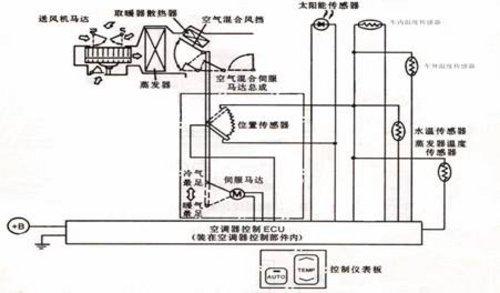 全自動(dòng)溫度控制系統(tǒng)的組成包括溫度傳感器、控制系統(tǒng)ECU、執(zhí)行機(jī)構(gòu)等。其中溫度傳感器有車(chē)外氣體溫度傳感器、車(chē)內(nèi)氣體溫度傳感器、日照傳感器(陽(yáng)光強(qiáng)度傳感器)和蒸發(fā)器溫度傳感器。