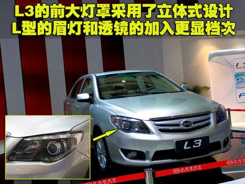 比亞迪L3的車燈設計也頗有特點,L型的鍍鉻燈眉一方面代表了L3的名字,也與中網(wǎng)的鍍鉻條相呼應。立體式車燈罩也為前臉增添了一絲生氣,全系配備透鏡,夜間使用帶來更佳的照明聚光效果。