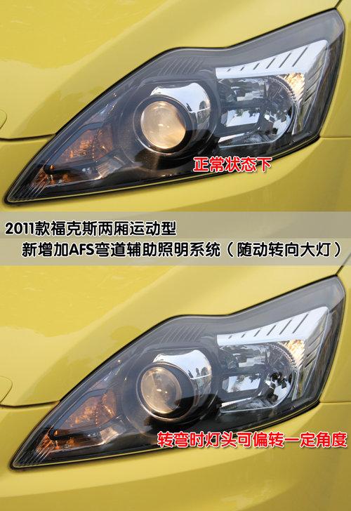 2011款福克斯兩廂運(yùn)動(dòng)型在安全配飾上新增加了AFS彎道輔助照明系統(tǒng),AFS是彎道輔助照明系統(tǒng)的縮寫(俗稱彎道大燈)。AFS系統(tǒng)有三種形式:1、轉(zhuǎn)向頭燈形式的,就是頭燈內(nèi)燈具可以左右旋轉(zhuǎn)8°至15°照明彎道死角。 2、利用獨(dú)立彎道照明系統(tǒng)的,就是在燈具里有一個(gè)固定的燈泡照向彎道,轉(zhuǎn)彎時(shí)候自動(dòng)點(diǎn)亮。3、利用左右霧燈進(jìn)行彎道時(shí)候照明,轉(zhuǎn)向時(shí)候?qū)?yīng)彎內(nèi)側(cè)霧燈亮起,照明彎道死角。而2011款?怂箖蓭\(yùn)動(dòng)型采用的是第一種形式,增強(qiáng)了夜晚行車的安全性。