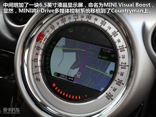 不用想,中控臺上最大的那個時速表肯定會成為視覺焦點,原因之一是時速表與兩側(cè)的空調(diào)出風口連為一體,簡直就是個米老鼠頭像,可愛至極。原因之二是這個時速表中間增加了一塊6.5英寸液晶顯示屏,顯然,MINI將東家的i-Drive多媒體控制系統(tǒng)移植到了Countryman上,命名為MINIVisual Boost,只是沒有寶馬上那個顯眼的控制旋鈕,在MINI上這個旋鈕被放在了換擋底座的后方,使用上還算順手,只是造型比較簡化,但同樣擁有兩個直觀的快捷鍵。