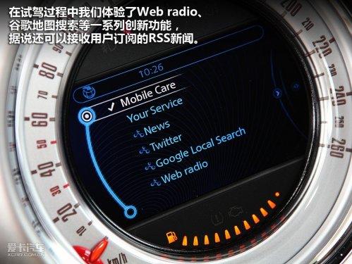 這套系統(tǒng)中整合了GPS導航、音響多媒體、車輛信息設置等諸多功能,最有特點的是其中MINIConnected這項功能,有了這套系統(tǒng),你可以將自己的蘋果iphone放入中央扶手,并與整套車載系統(tǒng)連接,可以延伸出更多的拓展功能,在試駕過程中我們體驗了Web radio、谷歌地圖搜索等一系列創(chuàng)新功能,據(jù)說還可以接收用戶訂閱的RSS新聞。目前這套系統(tǒng)是否會裝備在進入國內(nèi)的MINICountryman上我們還不得而知,但相信這種集成式的多媒體系統(tǒng)會是今后的發(fā)展趨勢。