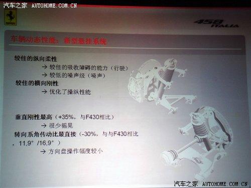 該車采用的新型底盤亦為鋁制,在底盤設(shè)計(jì)過程中,馬拉內(nèi)羅的工程師不僅運(yùn)用了各類先進(jìn)的合金材料,同時(shí)也從航空航天業(yè)借鑒了尖端的制造和焊接技術(shù)。在車輛動(dòng)力方面,法拉利458 Italia的懸掛系統(tǒng)在前部配備了雙叉骨,而后部則采用了多鏈系統(tǒng),借以提供最大的附著力和無與倫比的操控性能。該車的轉(zhuǎn)向傳動(dòng)比更加快捷高效,在實(shí)現(xiàn)極速入彎的同時(shí)也能保證超凡的駕駛舒適度。