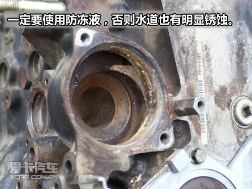 長期使用水而不使用防凍液會腐蝕水泵葉輪,尤其是金屬葉輪腐蝕最為嚴重。此外,水箱也會被水垢腐蝕造成管路堵塞,圖上這個腐蝕的情況是一般情況,更為嚴重的是葉輪已經徹底被腐蝕掉,散熱系統(tǒng)降低造成水溫過高而經常開鍋。