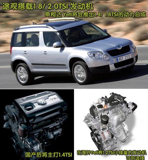上海大眾Tiguan途觀搭載的是1.8/2.0TSI兩款發(fā)動(dòng)機(jī),而很明顯Tiguan途觀主打1.8TSI排量的車型。而即將國產(chǎn)的斯柯達(dá)Yeti也將推出兩款排量的發(fā)動(dòng)機(jī)分別是1.4/1.8TSI,國產(chǎn)后因?yàn)榕cTiguan途觀定位不同,走的是“低價(jià)”路線,所以國產(chǎn)后后的斯柯達(dá)Yeti將主推1.4TSI。在海外市場(chǎng),斯柯達(dá)Yeti搭載了1.2/1.8TSI兩款汽油渦輪增壓直噴發(fā)動(dòng)機(jī)和一款具有三種調(diào)教的2.0TDI柴油發(fā)動(dòng)機(jī)。而1.2TSI發(fā)動(dòng)機(jī)已經(jīng)確定要國產(chǎn),并有望出現(xiàn)在斯柯達(dá)Yeti的身上。