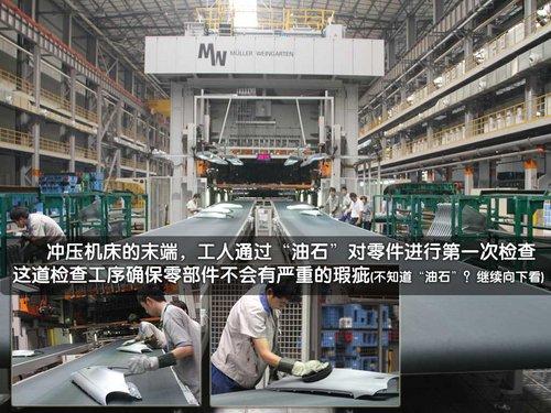 在生產(chǎn)線的中間是工作人員的監(jiān)控區(qū)域,工作人員可以通過監(jiān)視器看到整個沖壓車間的的生產(chǎn)狀況。而在每一個沖壓機(jī)床的末端,工人會對每一個沖壓出來的配件進(jìn)行粗檢。然后由一汽大眾的AUDIT評審專家,對配件進(jìn)行“比客戶更加苛刻”的標(biāo)準(zhǔn),去檢查配件的公益標(biāo)準(zhǔn)。
