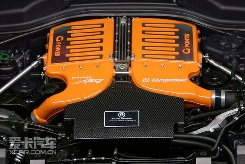 G-POWER將E60系列M5的V10發(fā)動機(jī)植入了造型優(yōu)雅的X6M上,同時,強(qiáng)化了活塞及連桿,并將排氣量由5.0升擴(kuò)充到5.5升,還增加了2個ASA T1-316機(jī)械增壓器,使該車在6800轉(zhuǎn)/分時,能夠爆發(fā)出900馬力,8000轉(zhuǎn)/分時,能夠達(dá)到870N.m的最大扭矩。但為了保證此車的動力輸出,G-POWER不得不將寶馬的6速自動變速器更換為6速手動變速器,而X-DRIVE四驅(qū)系統(tǒng)也不得不變?yōu)楹筝嗱?qū)動。