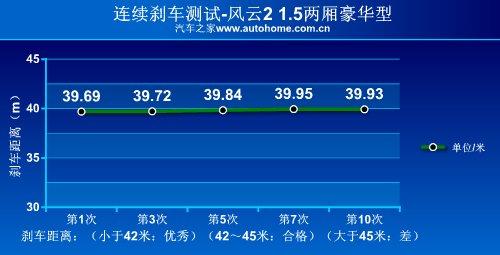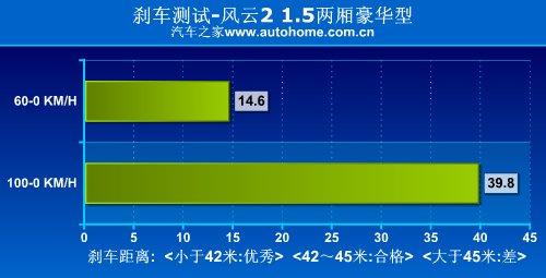 我們對(duì)風(fēng)云21.5L兩廂豪華型進(jìn)行的性能測(cè)試中顯示,從100KM/h全力制動(dòng)到車輛靜止,剎車距離為39.8米,成績(jī)非常出色;剎車踏板回饋力較大,所以在剎車時(shí)需要使用更大力氣,在日常駕駛中踏板的余量偏大,不過(guò)一旦深踩,制動(dòng)效果明顯。
