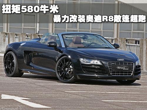 奧迪R8 spyder在今年的北京國際車展上正式亮相,火辣的外形讓其瞬間成為車展上最受歡迎的車型之一。奧迪官方版R8 Spyder搭載一款5.2升V10發(fā)動機(jī),最大輸出功率為392千瓦,峰值扭矩530Nm,最高車速313公里/小時。這一串?dāng)?shù)據(jù)對車迷們來說已經(jīng)相當(dāng)勁爆了,不過德國知名改裝廠商Sport-Wheel似乎對此并不滿足。他們近日推出了一款特別改裝版R8 Spyder,將動力提升到了令人驚嘆的448千瓦!