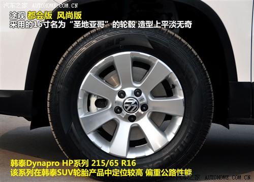 途觀的都會版和風尚版分別是低配和中配車型,兩者采用了名為“圣地亞哥”的16寸輪轂,造型上平淡無奇,搭配了215/65 R16的輪胎,品牌為韓泰Dynapro HP系列,在全系韓泰SUV輪胎產(chǎn)品中,該系列定位是“豪華SUV的高性能輪胎”,盡管官方的描述難免有些夸張,但不難看出它強調(diào)的是操控性能,這也與途觀的定位非常吻合,但是215mm的寬度對于SUV來說有些偏窄。