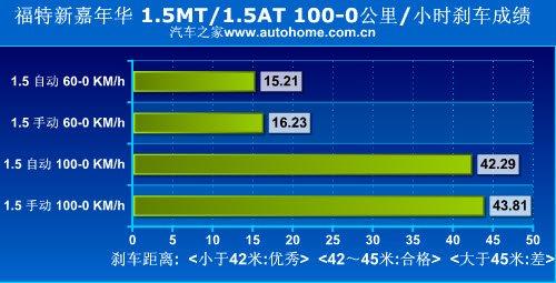 從實(shí)際的測(cè)試中也能看出,同樣搭載1.5L發(fā)動(dòng)機(jī)的車型,配合5速手動(dòng)變速箱就可以跑進(jìn)11秒內(nèi),而換用技術(shù)落后的4AT變速箱后加速成績(jī)則下降了將近兩秒。而在剎車方面嘉年華的表現(xiàn)一般,43米上下的成績(jī)只能算是合格水平。