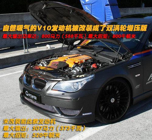 G – Power打造的這款M5是以老款的M5為基礎(chǔ),在本已經(jīng)非常強大的V10發(fā)動機倉中加裝了兩個渦輪增壓器,通過一系列的電腦以及油路等相關(guān)調(diào)校,讓老款的M5的動力性甚至超過了V12發(fā)動機。超過370km/h的最高時速比拼F1賽車。