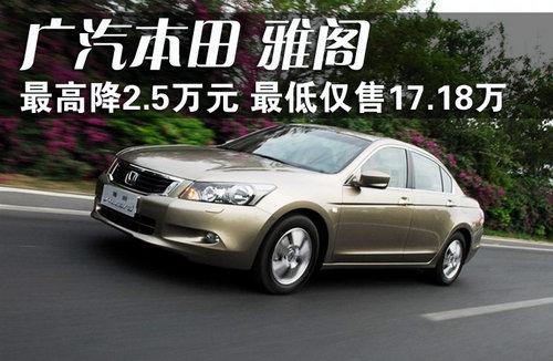 當提到中級車型大家也許會不約而同的想起廣本雅閣,新雅閣憑借其大氣的外觀、舒適的空間和豪華的配置對于中級轎車市場的構(gòu)成起到了舉足輕重的作用。去年,廣汽本田又對第8代雅閣進行了小改款,對原來車型的配置有一定程度提升,部分車型增加了智能鑰匙和后遮陽板等配置,提高了雅閣整體車型的性價比。近日根據(jù)網(wǎng)上車市價格監(jiān)測系統(tǒng)顯示,目前雅閣現(xiàn)金最高優(yōu)惠2.5萬元,最低售價逼平17萬。具體價格以及優(yōu)惠幅度如下: